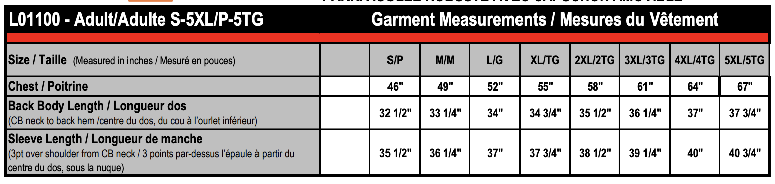 275 gsm – 8.1 oz./yd2 – 13.5 oz./lin. yd 100% polyester oxford with 3000 mm waterproof rating, 3000 gsm breathability rating, wind resistant and water repellent finish. Insulation: 200 gsm body 100% polyester 3M Thinsulate, 170 gsm sleeves 100% polyester. Waterproof zippers on chest and arm with two lower coil zippered pockets, 2 way front zipper, detachable hood, reflective piping, adjustable tab closure on cuffs and inside pockets.