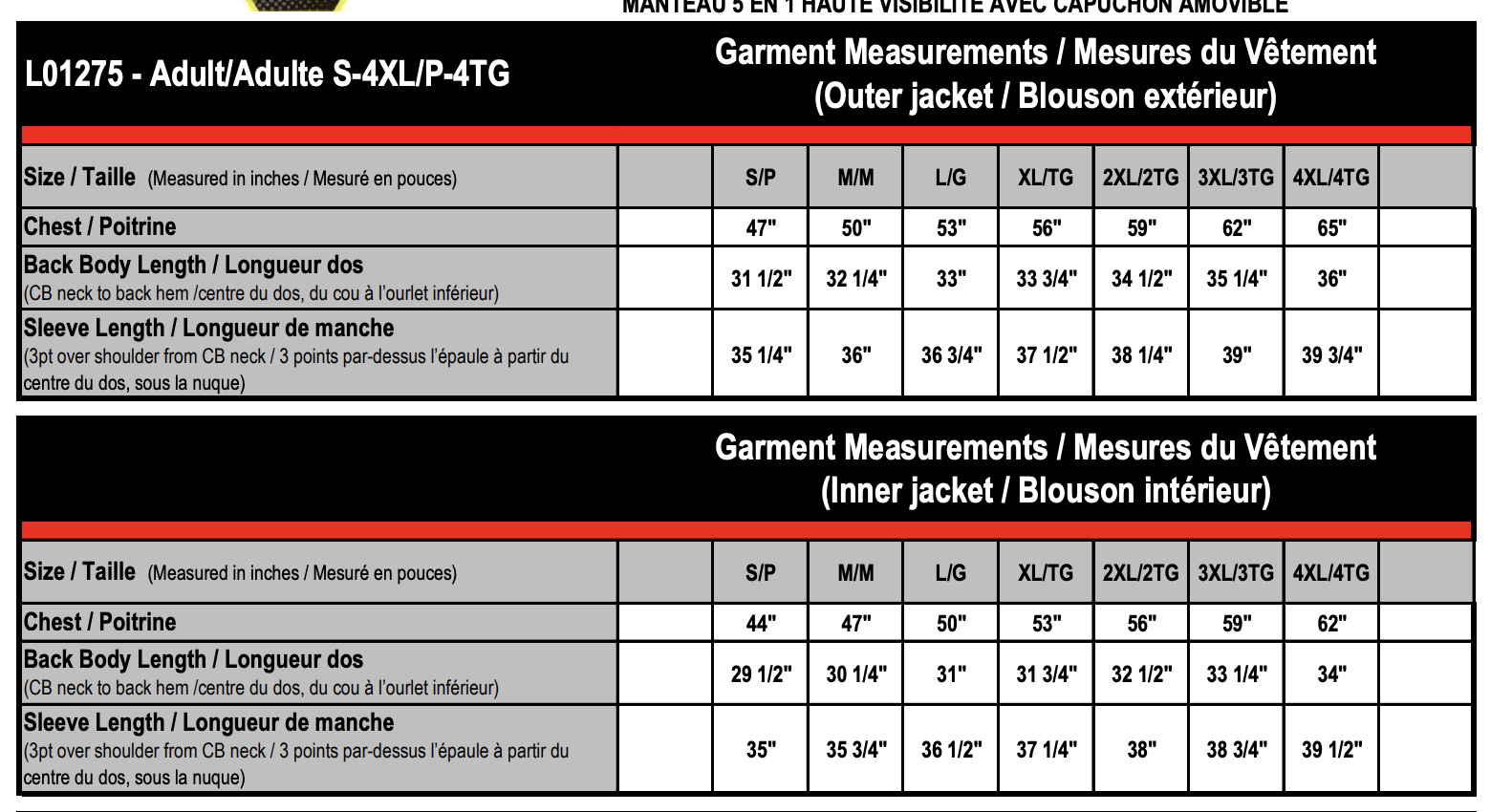 Outer jacket: 215 gsm - 6.3 oz./yd² - 10.5 oz./lin. yd 100% polyester oxford 3000 mm waterproof rating, 3000 gsm breathability rating, wind resistant and water repellent finish. Inner jacket: 68 gsm - 2 oz./yd² - 3.5 oz./lin. yd 100% polyester taffeta with wind resistant and water repellent finish. Insulation: 180 gsm 100% polyester. 100% polyester oxford woven exterior jacket fully seam sealed with waterproof, breathable coating. Snap detachable hood with adjustable drawcord. Chest zipper pocket and clear plastic ID holder. Lower front flap welt pockets with hook and loop closure. Adjustable tabs on sleeve cuff. Side access with zipper at hem. Two-way YKK center front zipper. Two inner patch pockets. Zocket embroidery access. Zip out reversible insulated diamond quilted inner jacket in 100% polyester. Zip off sleeves. Rib knit collar and cuff. Patch pockets on exterior and interior of inner jacket. 4” hi-vis contrast band with 2” reflective tape on front and back body and sleeves. Meets CSA standards.